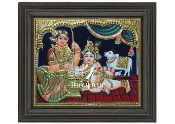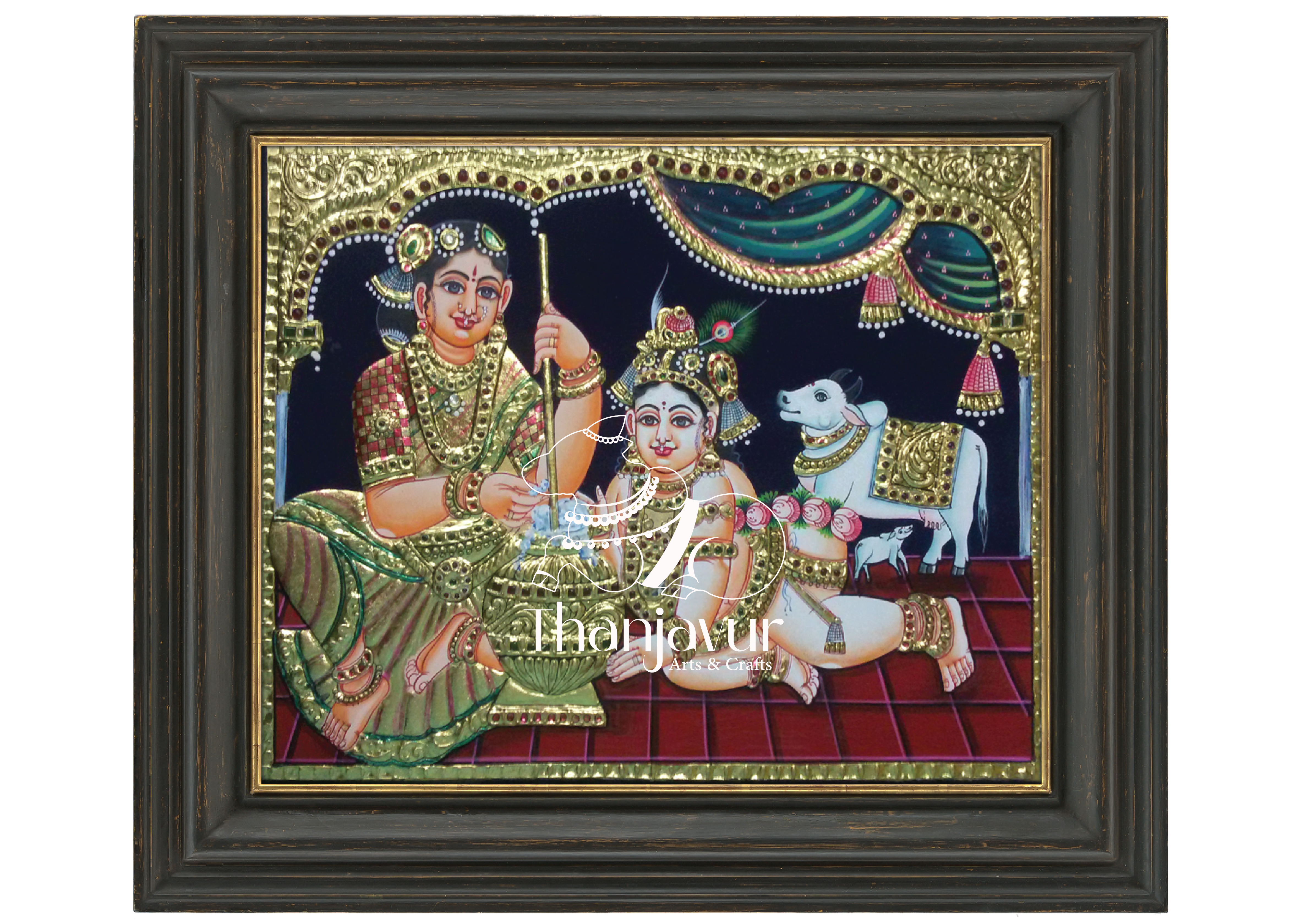 "Discover the divine affection between Yashoda and young Krishna, surrounded by the sacred cow, symbolizing nurture and protection. This Tanjore painting radiates maternal love, devotion, and spiritual blessings.!"