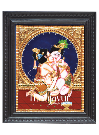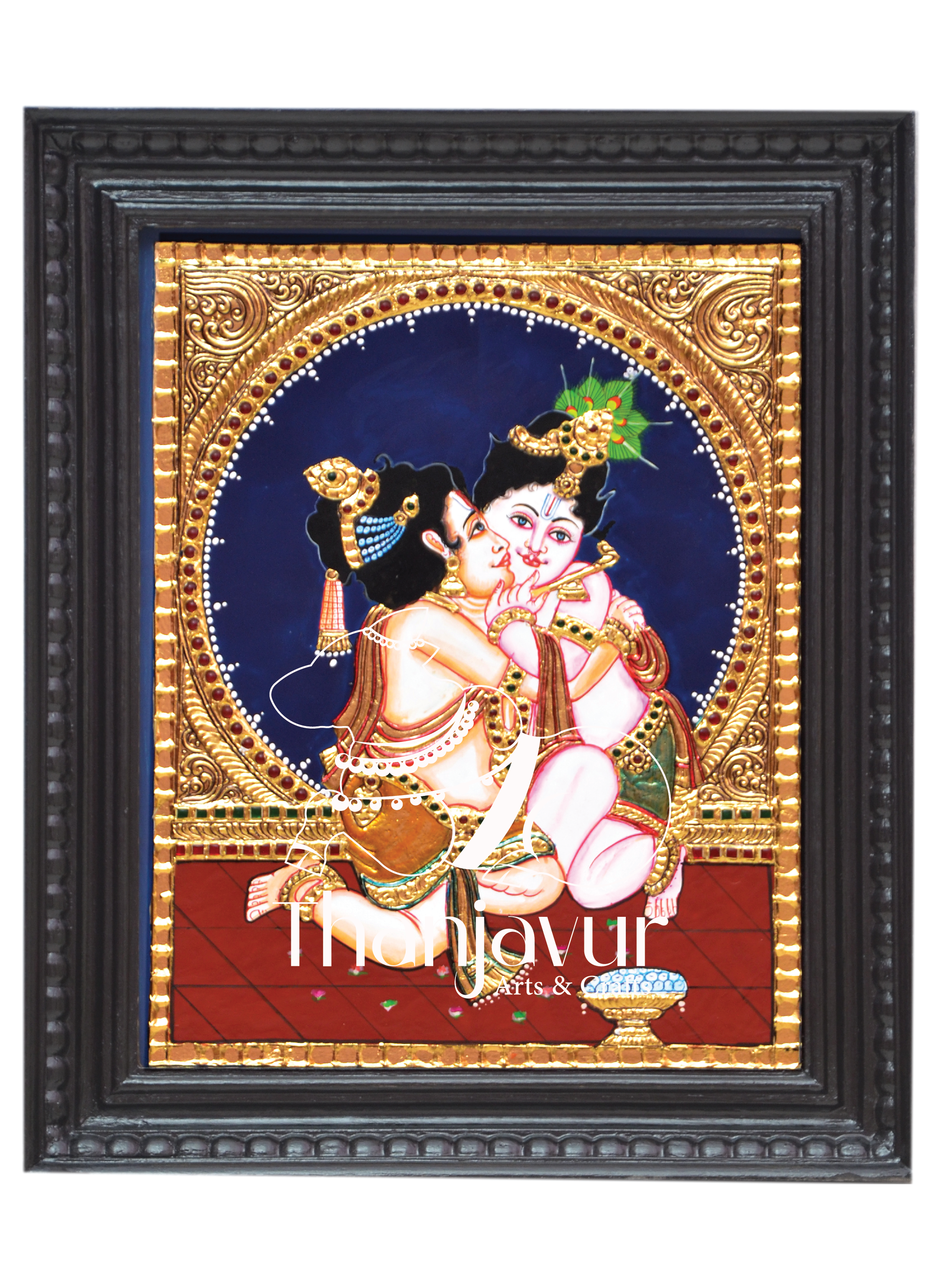 "Witness the playful and protective bond between Krishna and His elder brother Balaraman, depicted in this exquisite Tanjore painting. It symbolizes unity, love, and divine blessings.!"