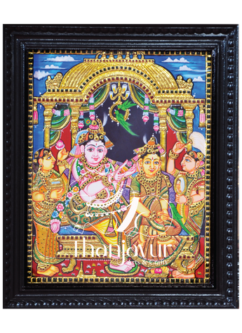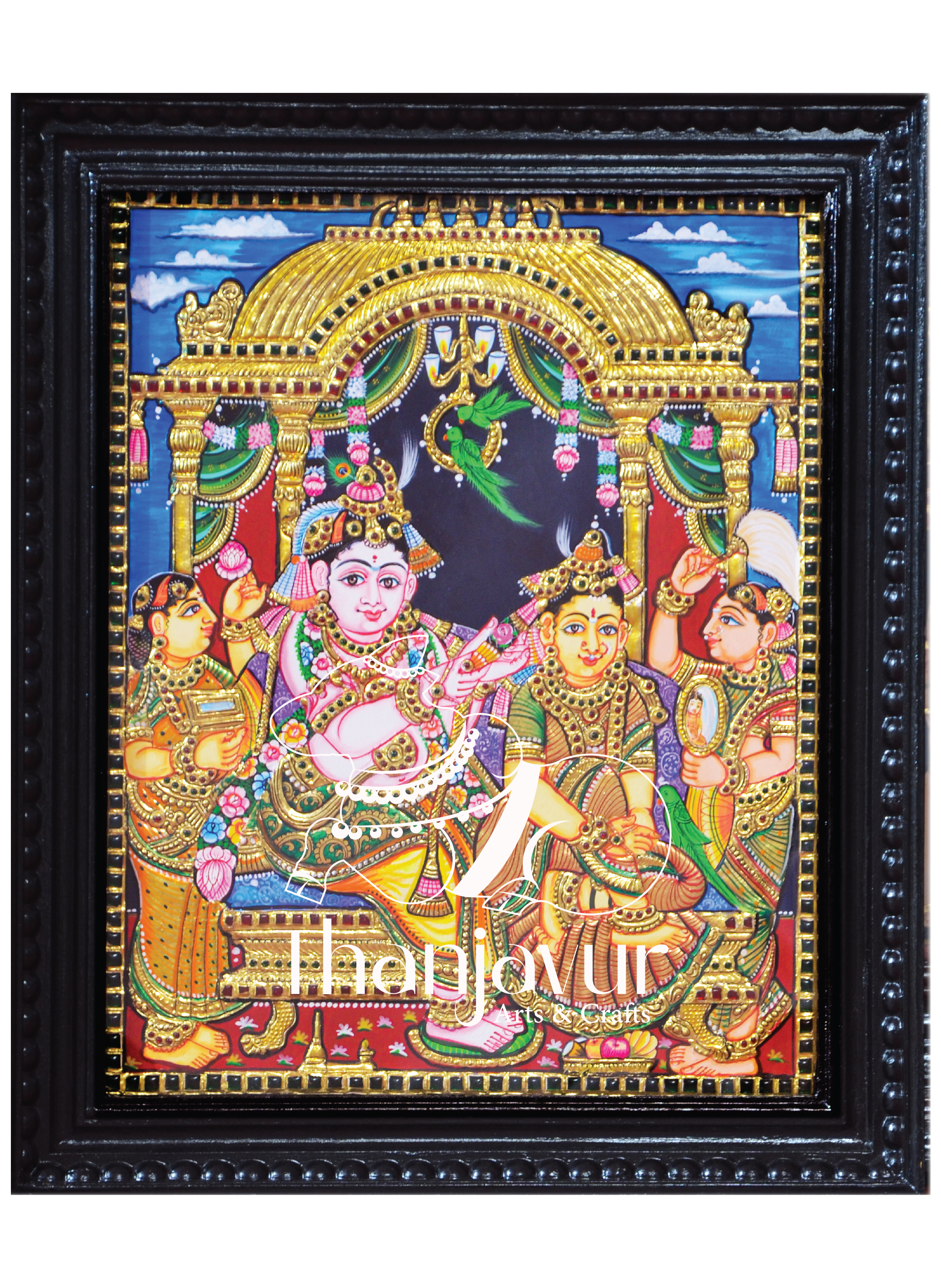 "Behold the unique charm of Jada Krishna, adorned with His divine locks and vibrant attire. This Tanjore painting is perfect for invoking joy, peace, and spiritual devotion in your space.!"