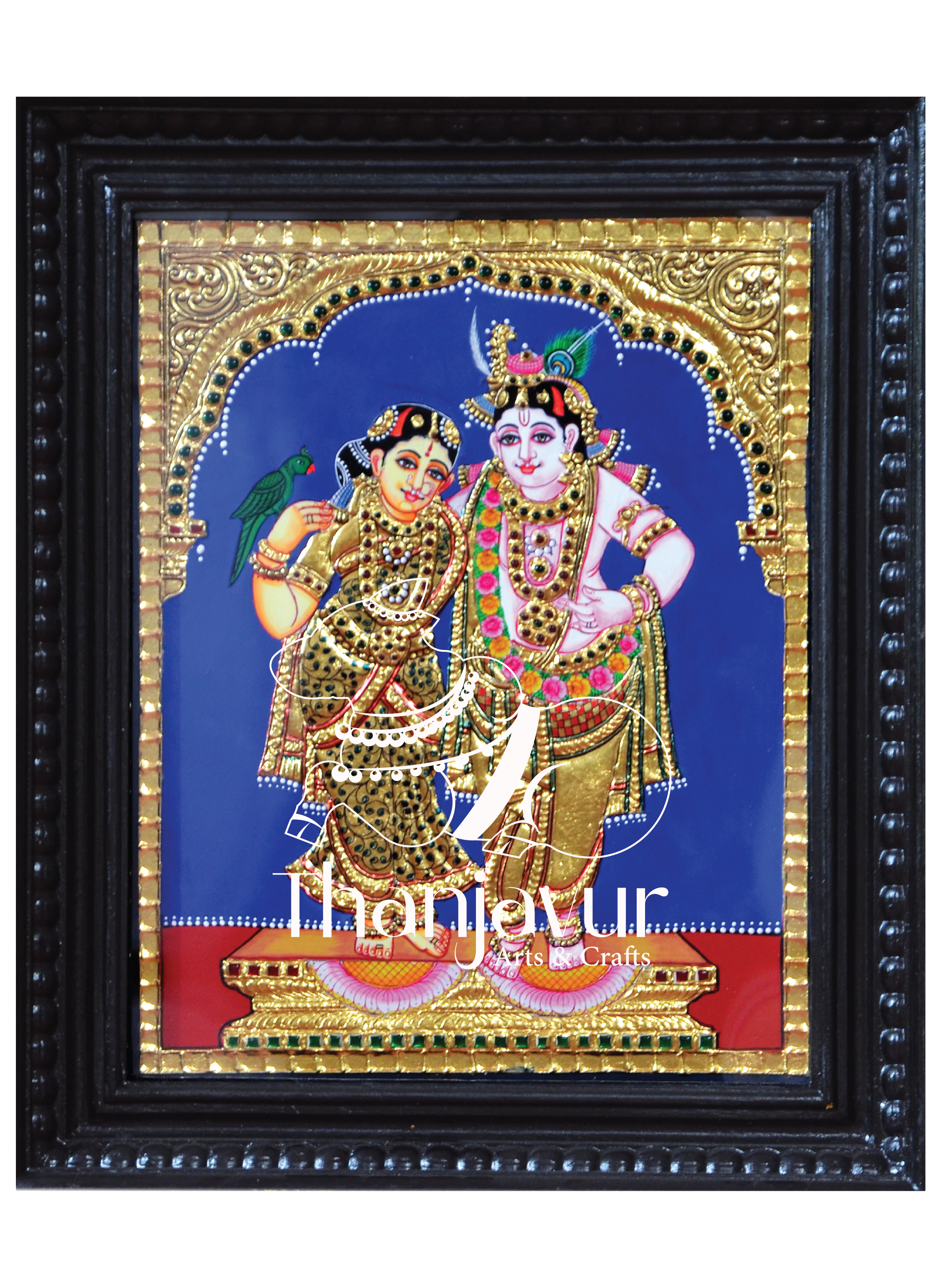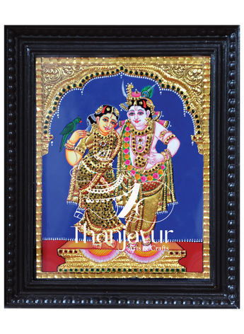 "Our Tanjore painting beautifully portrays Radha and Krishna amidst a serene dark blue background, symbolizing devotion, harmony, and spiritual love. This artwork enriches your home with divine energy.!"