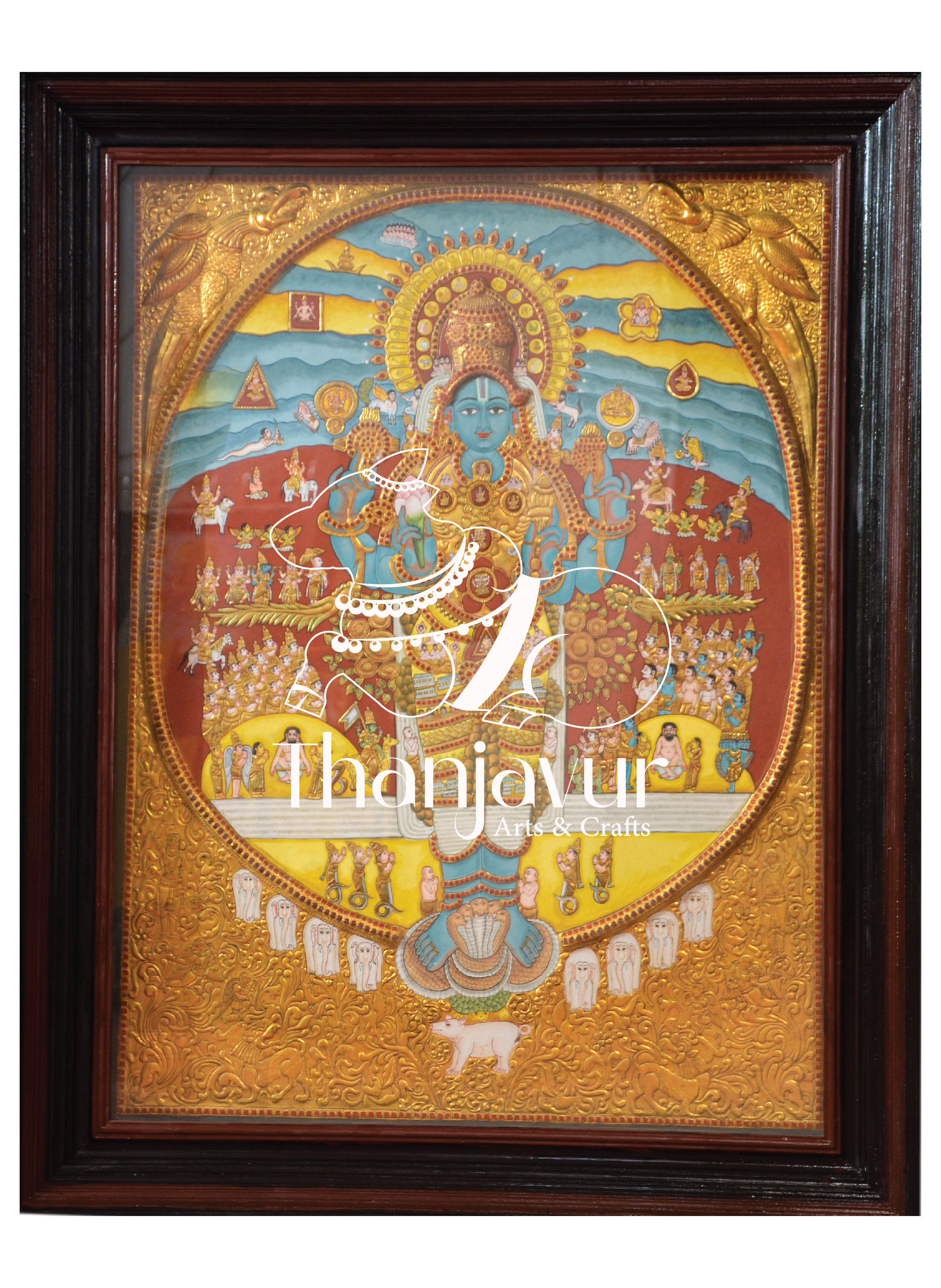 "Experience the awe-inspiring grandeur of Lord Vishnu's Vishwaroopam, the universal form that encompasses the entire cosmos, portrayed in our exquisite Tanjore paintings. Crafted with precision and adorned with gold embellishments, these artworks capture the infinite power, divinity, and magnificence of this celestial revelation. Each painting is a timeless masterpiece, symbolizing the omnipresence and supreme authority of Lord Vishnu. Bring home this divine depiction to invoke spiritual enlightenment, protection, and a deep sense of connection with the universe.!"