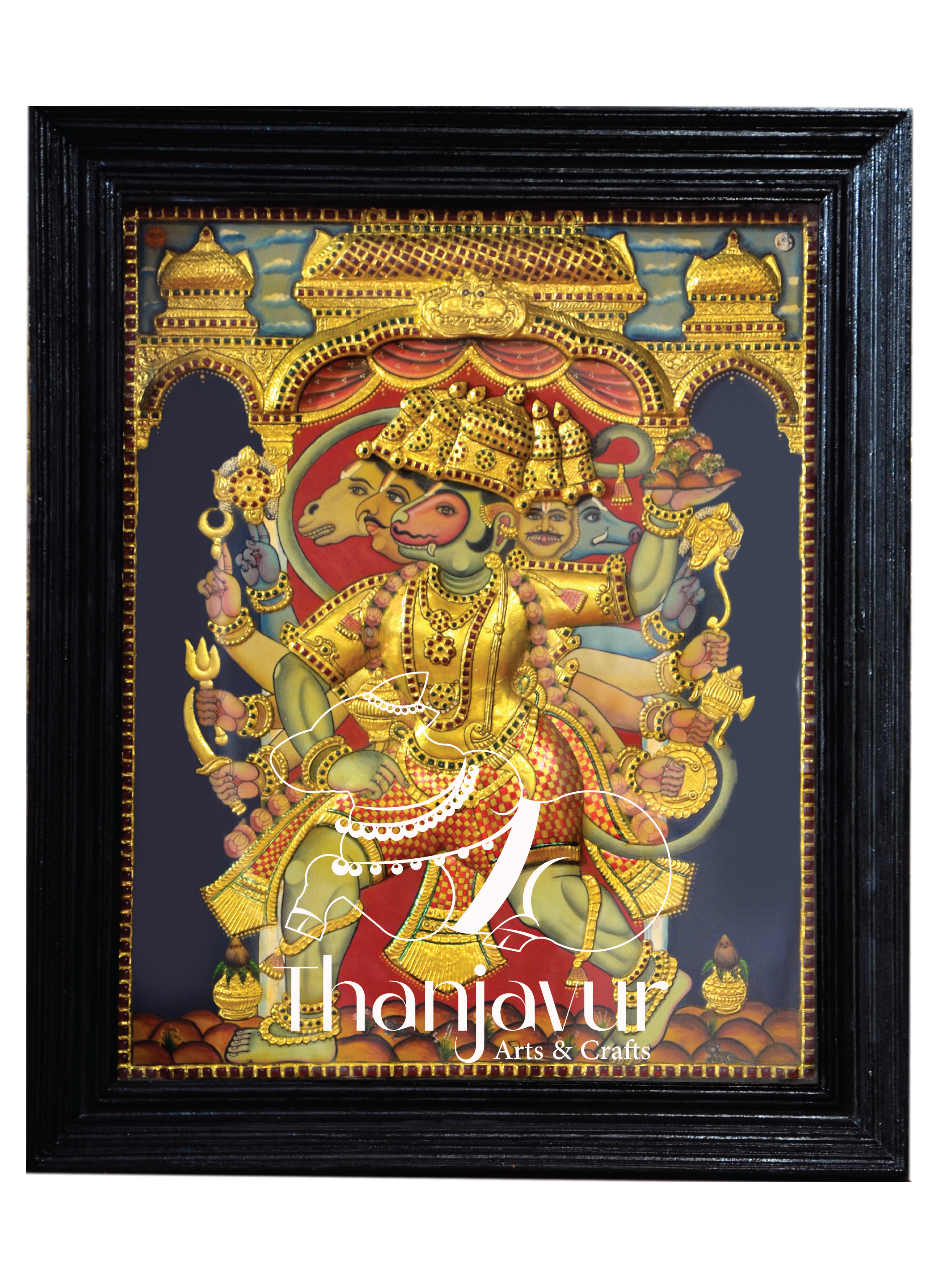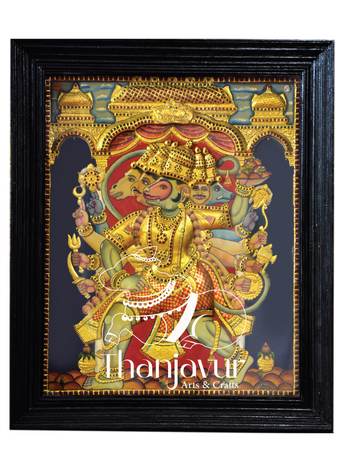 "Admire the grandeur of Panchamuga Anjaneyar encased in a magnificent arch, symbolizing divine protection and spiritual power. These Tanjore paintings, with intricate detailing and radiant hues, bring alive the sacred essence of Lord Hanuman. Ideal for your home, this masterpiece invites divine strength and unwavering faith.!"