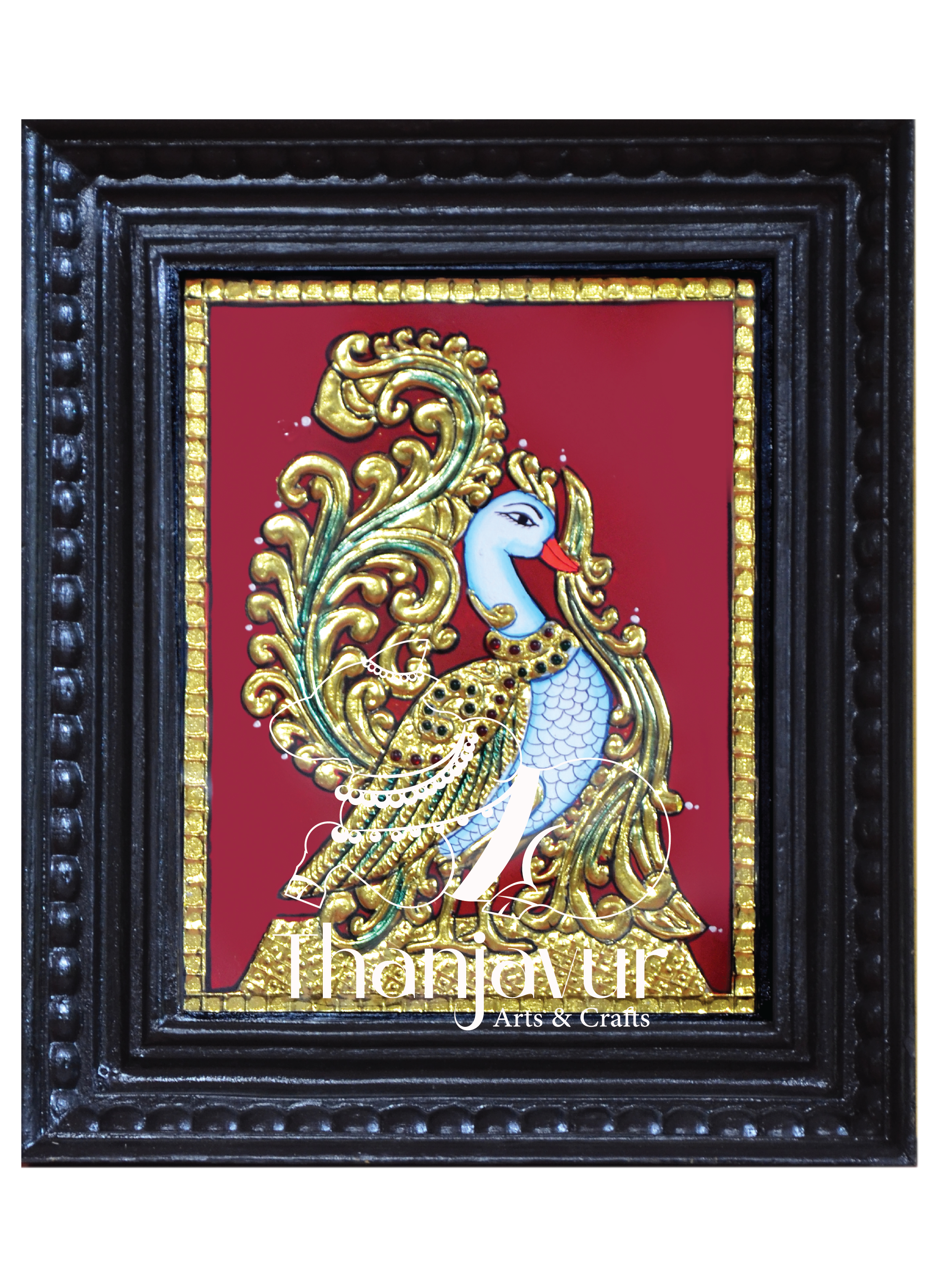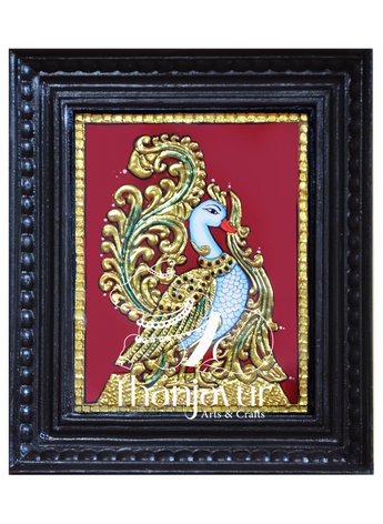 This peacock design Tanjore painting is a perfect addition to your living space, radiating positivity and artistic splendor. It also makes a thoughtful gift for loved ones, symbolizing joy and prosperity.