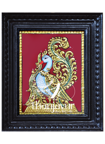 This exquisite Tanjore painting features a majestic peacock, symbolizing beauty, grace, and prosperity. The artwork is a harmonious blend of intricate detailing, vibrant colors, and rich embellishments, making it a timeless masterpiece. The peacock, adorned with shimmering gold foil and intricate patterns, stands as a symbol of purity and elegance, adding a divine charm to any space.