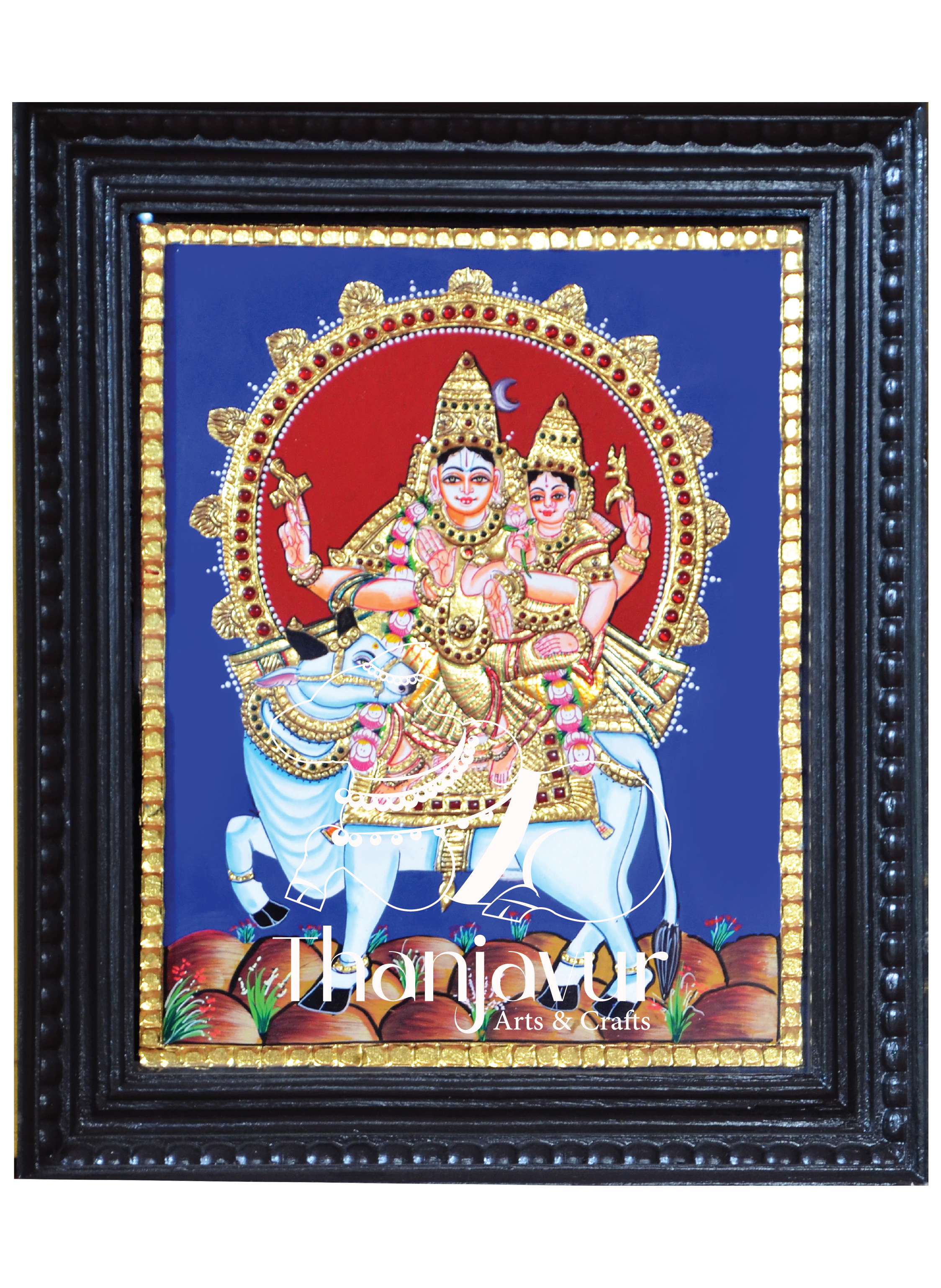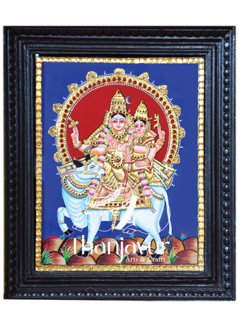 "Adore the Divine Union of Shiva and Parvati on Rishaba Vahanam through Exquisite Tanjore Art."