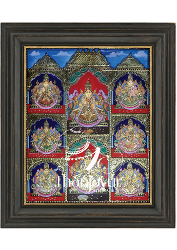 "Celebrate the divine grace of the eight forms of Goddess Lakshmi, symbolizing wealth, knowledge, courage, and prosperity. A perfect Tanjore painting for auspicious blessings in your home."
